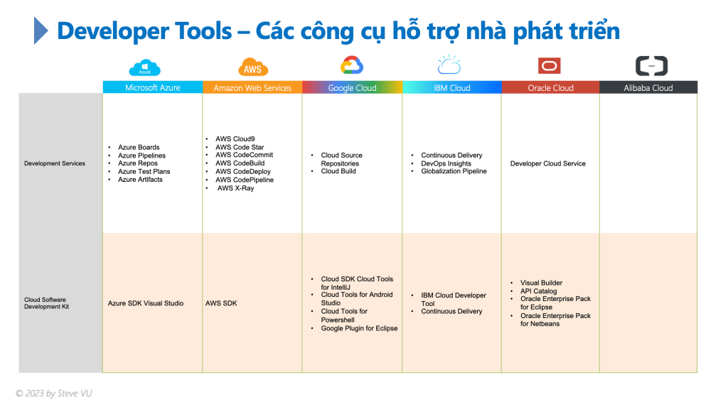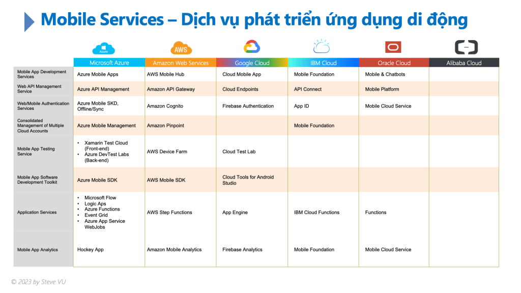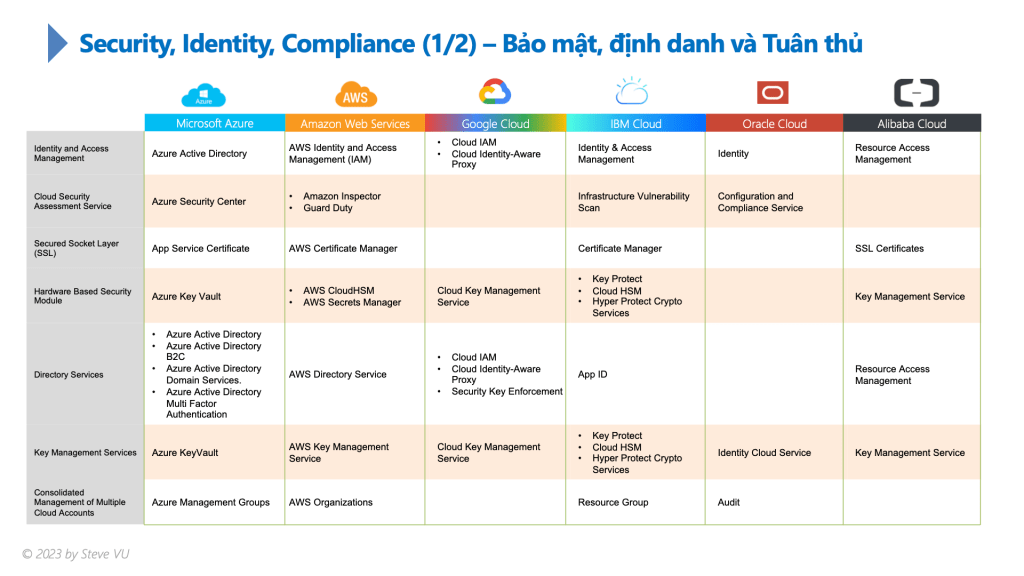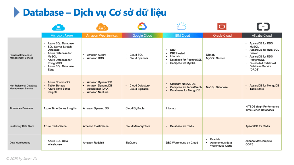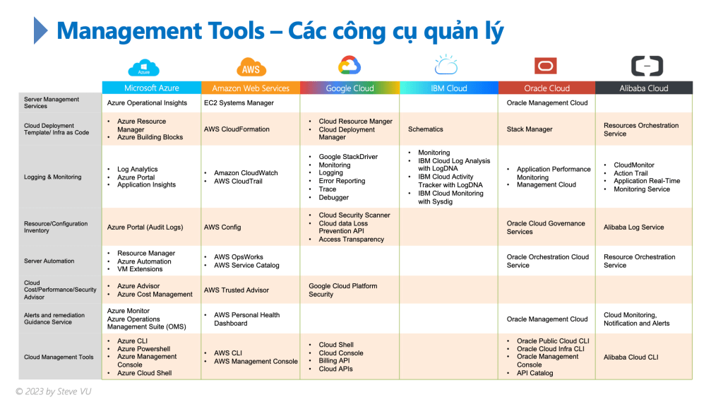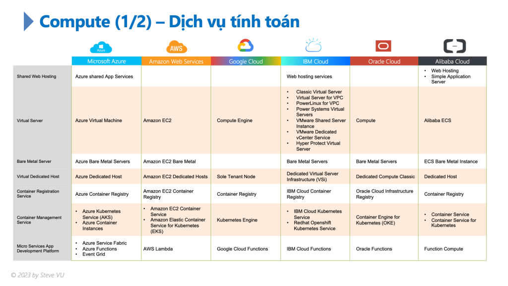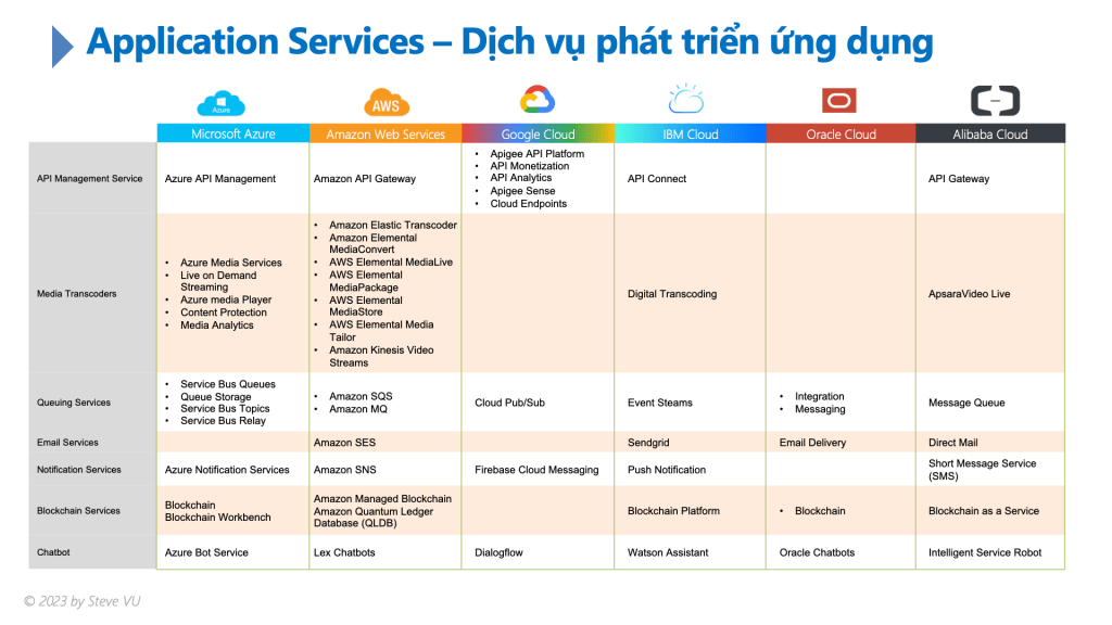 Trong bài viết này, chúng ta đã tổng hợp về các dịch vụ tương ứng giữa các nhà cung cấp dịch vụ Cloud hàng đầu như Microsoft Azure, Amazon Web Services, Google Cloud, IBM Cloud, Oracle Cloud và Alibaba Cloud. Các dịch vụ này đều mang đến những giải pháp và công nghệ đa dạng, cho phép doanh nghiệp tùy chỉnh và triển khai các ứng dụng và hệ thống trong môi trường đám mây một cách linh hoạt và hiệu quả.