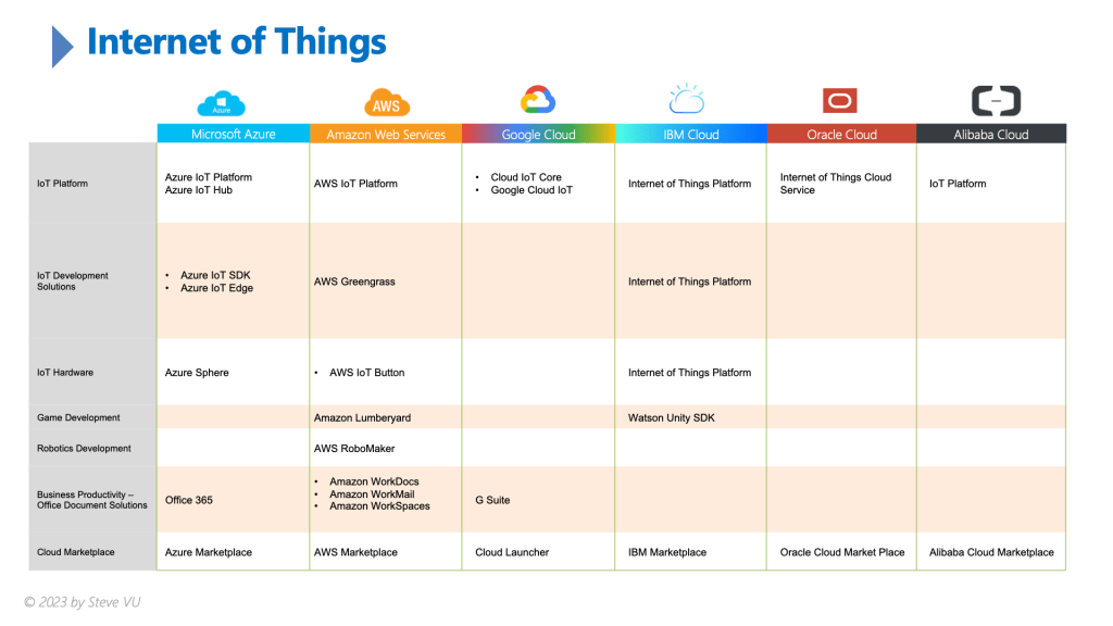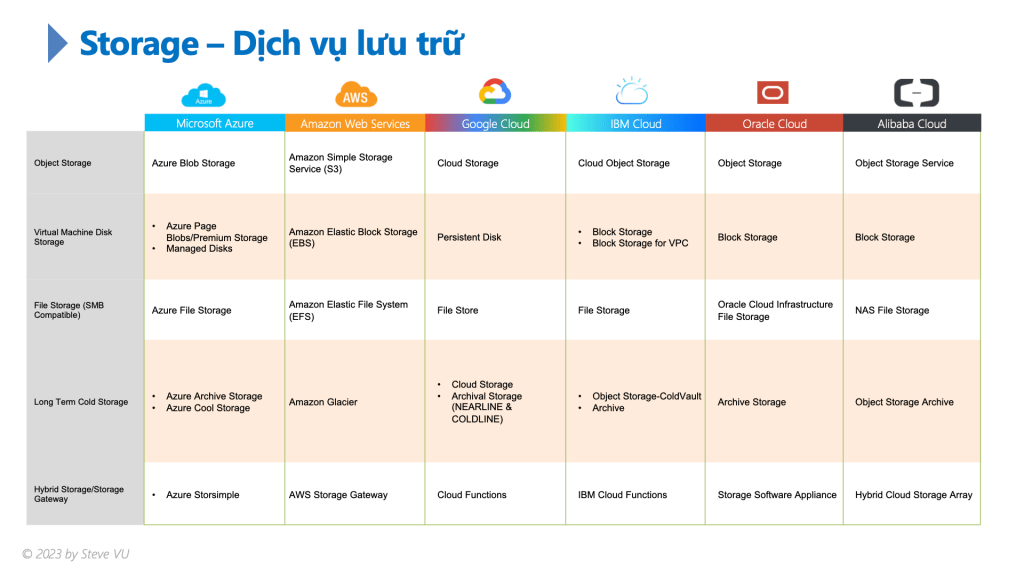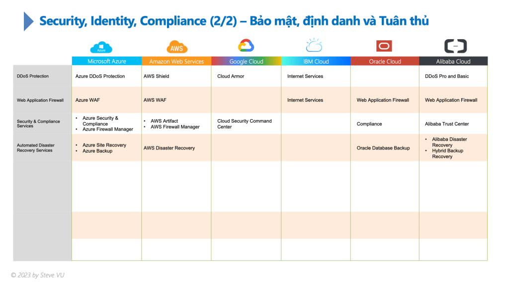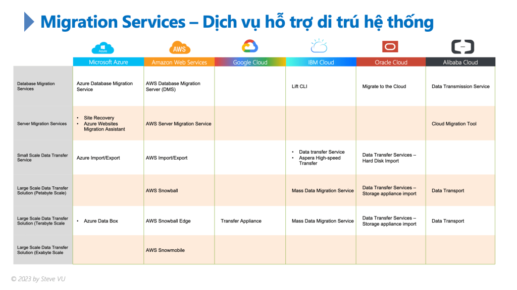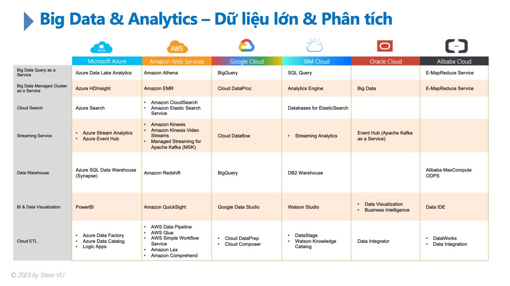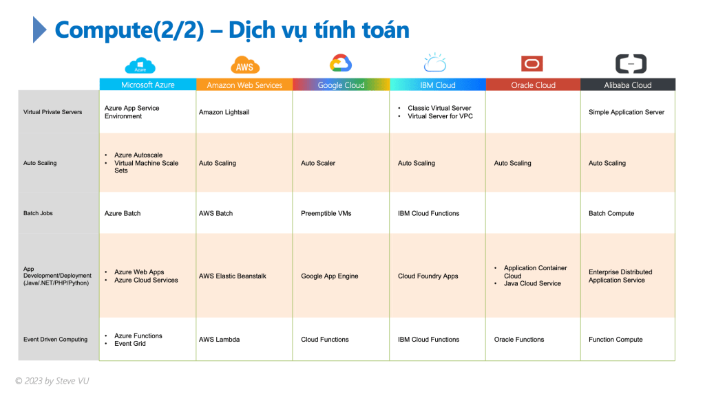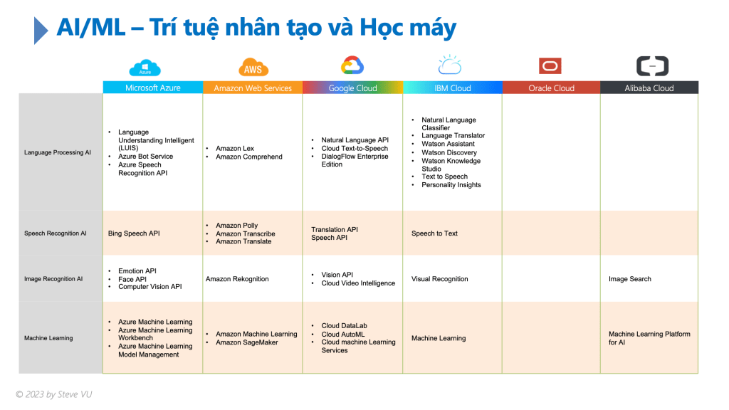 Trong bài viết này, chúng ta đã tổng hợp về các dịch vụ tương ứng giữa các nhà cung cấp dịch vụ Cloud hàng đầu như Microsoft Azure, Amazon Web Services, Google Cloud, IBM Cloud, Oracle Cloud và Alibaba Cloud. Các dịch vụ này đều mang đến những giải pháp và công nghệ đa dạng, cho phép doanh nghiệp tùy chỉnh và triển khai các ứng dụng và hệ thống trong môi trường đám mây một cách linh hoạt và hiệu quả.