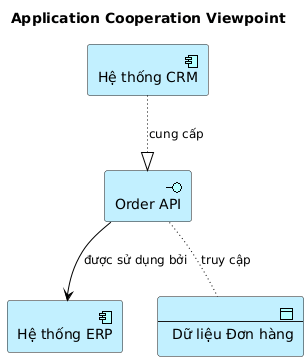 Application Component (Thành phần Ứng dụng) khác nhau (ví dụ: “Hệ thống CRM”, “Hệ thống ERP”) tương tác với nhau thông qua các Application Interface (Giao diện Ứng dụng) và trao đổi các Data Object (Đối tượng Dữ liệu) (ví dụ: “Đơn hàng của khách hàng”).